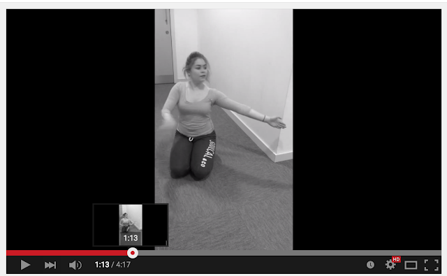 I also added more choreography, this was performed by Sophie and was a different style of movement. I wanted to move away from the video looking like to was in the style of Rosa so I created a different set of motif without using the chairs and showing more jumping, turns and a way of using the space more. When doing this i also changed the setting of which the choreography was filmed. It was filmed in the corridor of the Performing Arts block, not the Dance Studio. This was to show the viewers/audience a different setting and try to keep them interested in the video and also to show the movement without using the chairs.